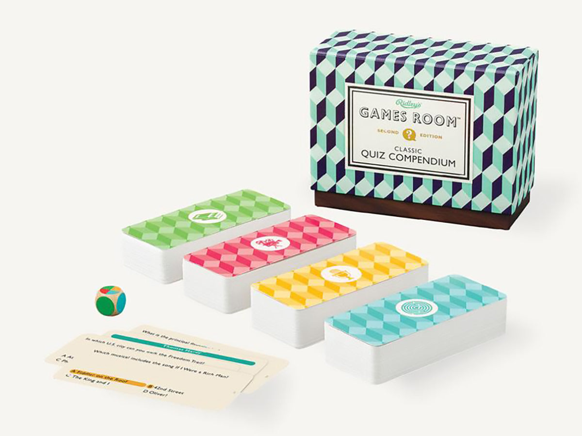 Get ready for a classic quiz night-in with this revamped Classic Quiz Compendium from Games Room! Do you have what it takes to be crowned the Ultimate Quiz Champion? Get your thinking caps on for General Knowledge, test your cinematic knowledge with Movie Buff, battle through mental acrobatics with Brain Teasers, and recall the glory days of classic tunes with Pop Music. Simply take turns to roll the die and answer the corresponding quiz card to begin the fun. Includes 4 x 70 game cards, decision die and instructions. Packaged in a stylish geometric patterned box.