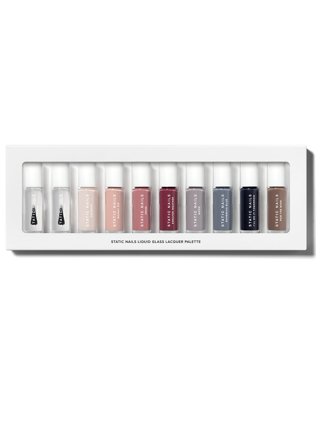COZY YEAR-ROUND COLORS: This limited-edition capsule collection contains ten custom bottles of Static Nails Liquid Glass Lacquer, a breakthrough formula loaded with rich pigments and natural antioxidants for a healthier manicure that actually lasts up to 10+ days without chipping.