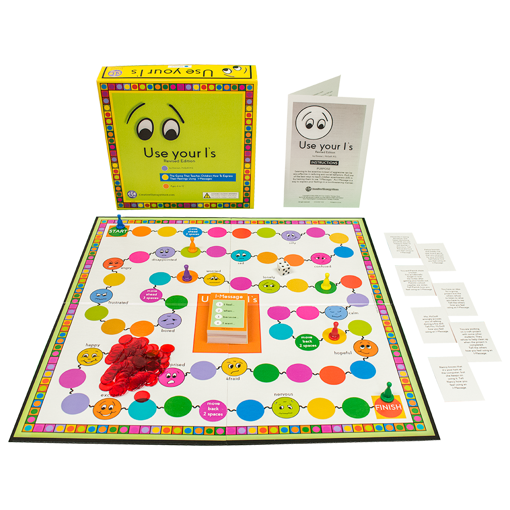 Use Your Is is a board game that teaches children how to express their feelings without jeopardizing the rights of others. Game cards provide realistic situations that provoke emotions such as anger, guilt, humiliation, happiness, and embarrassment. Players learn to verbally describe their feelings to others and explain why they feel the way they do. Use Your Is also helps children become comfortable using the first-person pronoun to share their feelings.
